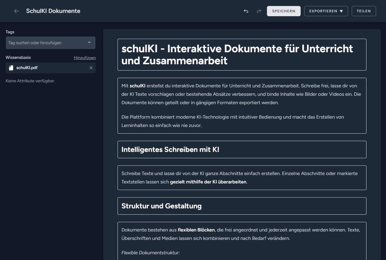 Die KI unterstützt beim Verfassen und Überarbeiten von Texten. Abschnitte können automatisch erstellt, angepasst oder sprachlich verbessert werden.