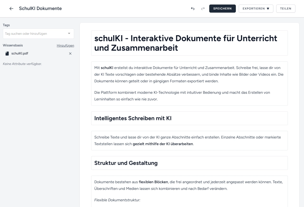 Erstellte Dokumente können online freigegeben oder als PDF, Word oder Markdown exportiert werden.